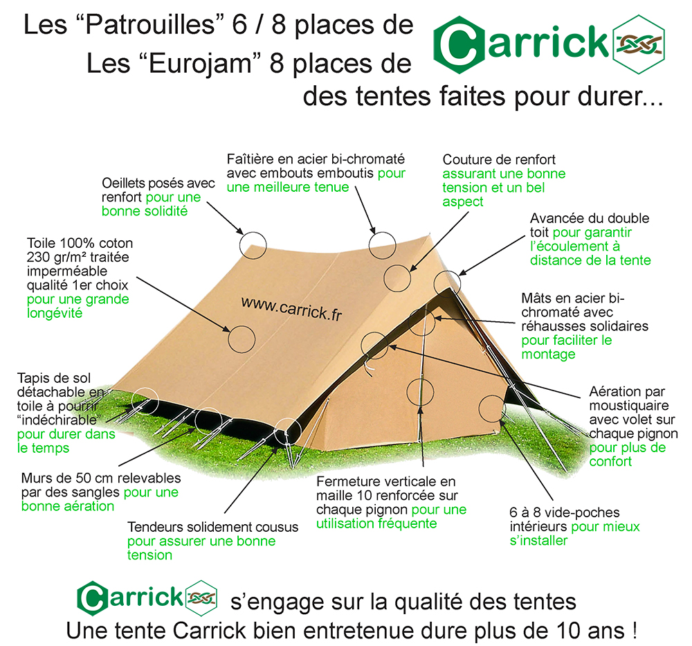 - Murs de 50 cm relevables par des sangles, toile traitée imperméable et imputrescible, 100% coton 235 g/m², 6 vides poches, fermeture à grosse maille sur 2 pignons.